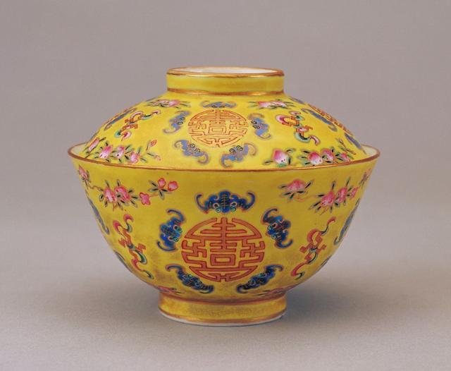 故宫博物院 | 清·黄地粉彩五蝠捧寿字盖碗