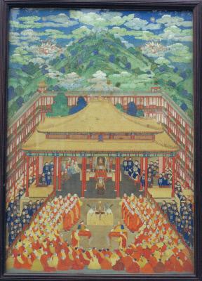 上图故宫博物院所藏的《万法归一》图屏,即乾隆三十六年(1771年),土尔扈特人不堪沙皇俄国压迫,在汗王渥巴锡率领下举族东返,归附清廷。对于土尔扈特部的回归,清政府十分重视,时年61岁的乾隆皇帝对他们热情款待,特地安排他们与自己在新建的万法归一殿内听高僧讲佛法。万法归一殿是河北承德普陀宗乘庙内的重要建筑物,乾隆皇帝希望在所统辖的辽阔疆域内,各个民族都因拥有共同的信念而团结一致,万法归一。