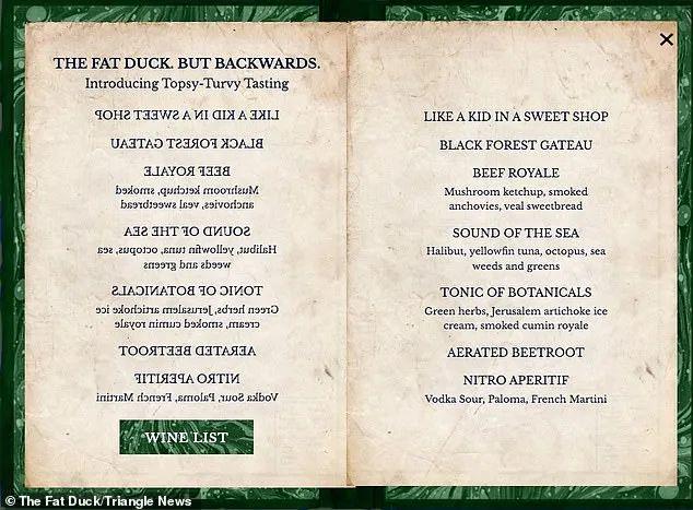 还有这份必须倒着吃的套餐,客人向小孩子一样从小蛋糕、布丁开始品尝,接着是蘑菇番茄酱的皇家牛肉、烟熏凤尾鱼和小牛胸腺,然后享用“海之声”——主菜包括大比目鱼、黄鳍金枪鱼、章鱼、海藻和蔬菜。最后是美味的开胃菜和开胃酒。