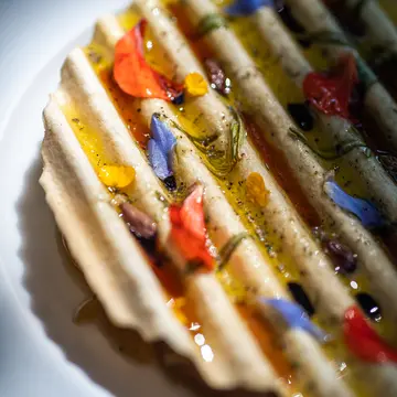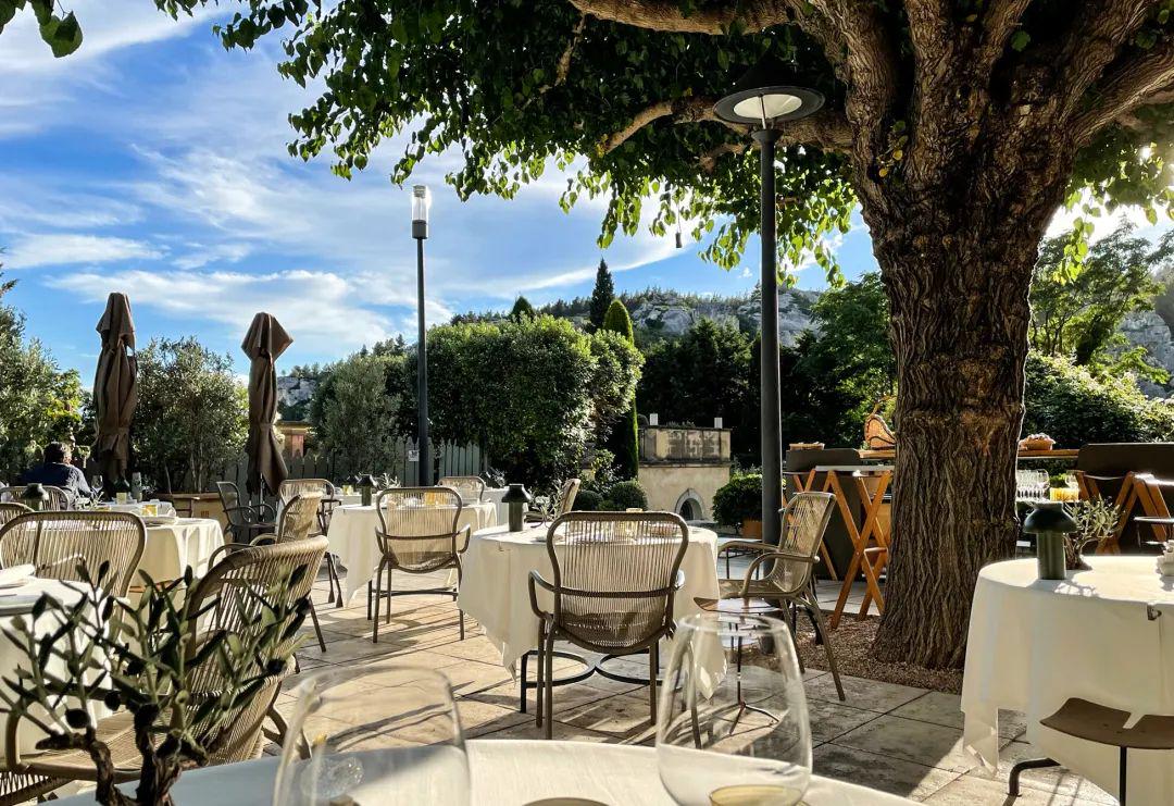 "那羊腿由酥皮包裹着,服务生在桌边分切,搭配马铃薯千层和四季豆,我们还吃了番茄罗勒鲻鱼,甜点是Baumanière招牌舒芙蕾内馅薄饼。"