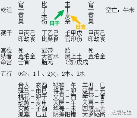 如下图绿箭头为日干丁火,黄箭头为日支亥水,由此可以得知此八字为日干丁火被日支亥水克制,即日支克日干,那么可参考本篇文章了解此人的婚姻情感模式和部分早晚婚相关的信息。其他干支关系同理,需要自身有一定的天干地支和五行生克的基础知识,如不清楚可以看本人的《从零开始学术数》中的天干、地支、五行章了解。