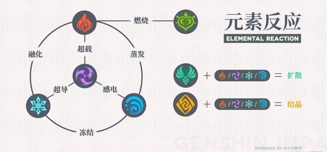 蒸发融化,按照百分比提升本次伤害,可暴击。水元素打火附着2倍伤害,反之1.5倍;火元素打冰附着2倍伤害,反之1.5倍。超载,造成范围火属性爆炸伤害【固定3.75倍】感电,额外雷元素伤害【固定2.5倍】扩散,扩散元素造成伤害【固定1倍】超导,造成范围冰属性伤害,降低敌人40%物理防御【固定1.25倍】冻结,冰冻敌人,无法动弹(碎冰有一个额外伤害【固定3倍】)结晶,产生结晶护盾根据以上反应,就可以进行队伍阵容的搭配了。因为只有蒸发融化是非固定伤害,可以享受攻击暴击等带来的增幅,所以角色在触发反应时能够造成成吨的伤害,这也是为什么看到被人打出来的百万伤害都是能够造成蒸发融化反应的角色。