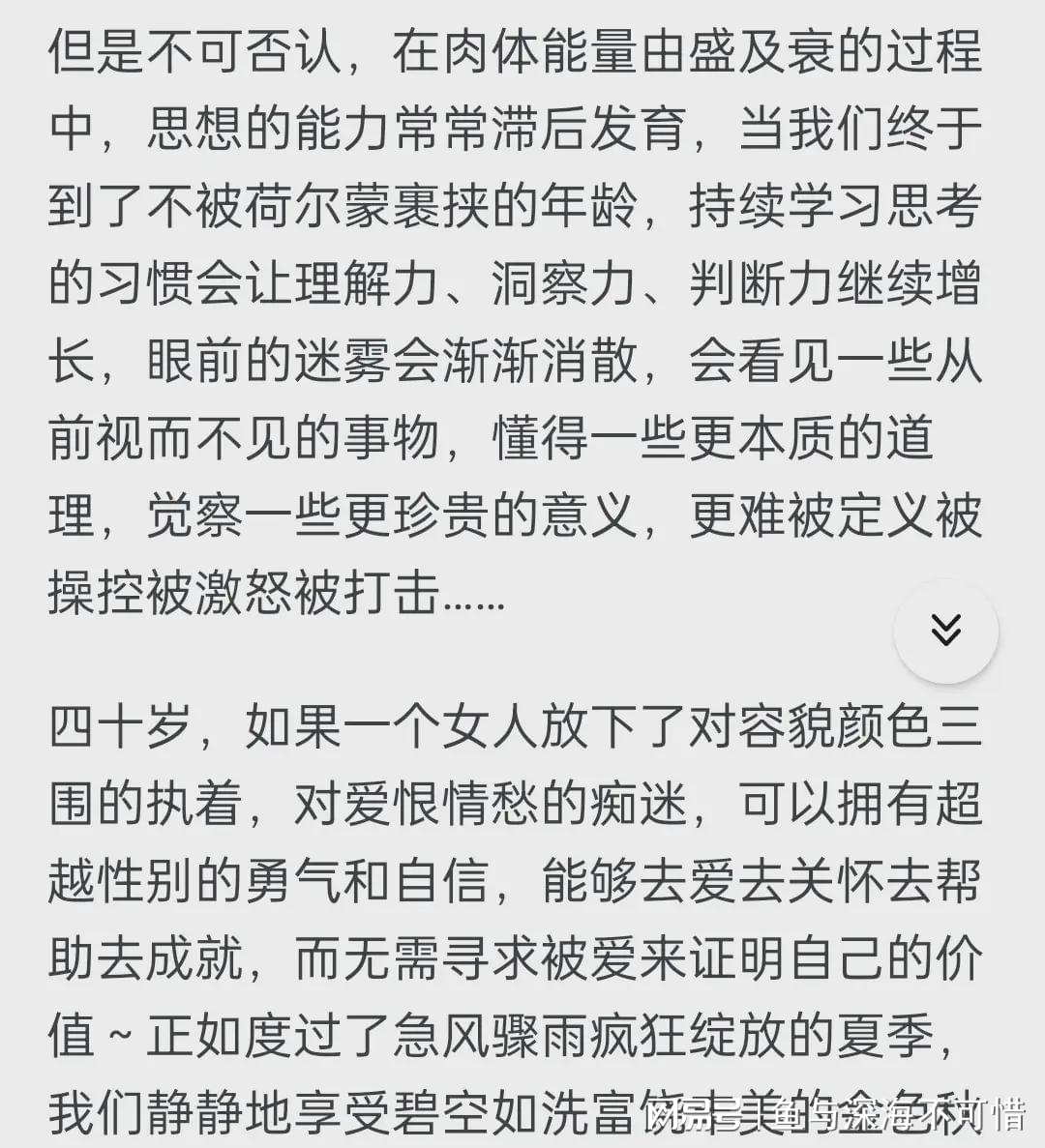 网友:衰老是真实的,而且最终会带走一切~我们能够做的就是投入地去生活,身为女性而不拘泥自限于女性。今夜有暴雨,下午花儿开得正好。四十岁的女人没有很老。